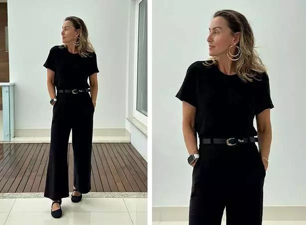 Dando início às nossas dicas de look com sapatilha para trabalhar, a melhor saída para facilitar a composição é investir no bom e velho all black, que nunca decepciona. Com uma blusa ou camiseta básica, uma calça pantalona longa ou curta e o par clássico nos pés, o visual fica sofisticado, prático e confortável, pronto para te acompanhar o dia todo – inclusive no happy hour pós-expediente!.