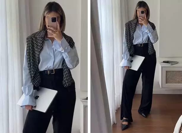 Para completar, a camisa social feminina fica responsável por um toque ainda mais elegante, assim como o par de bico fino nos pés, enquanto a sobreposição em tweed aparece como peça de segurança para caso você precise se proteger do ar condicionado do escritório. Não tem erro!