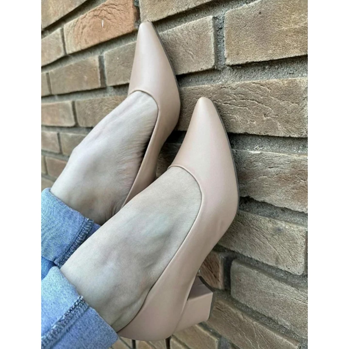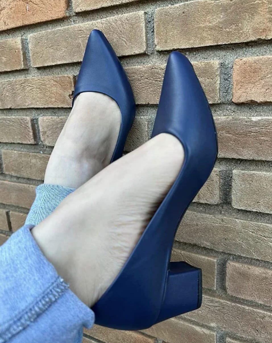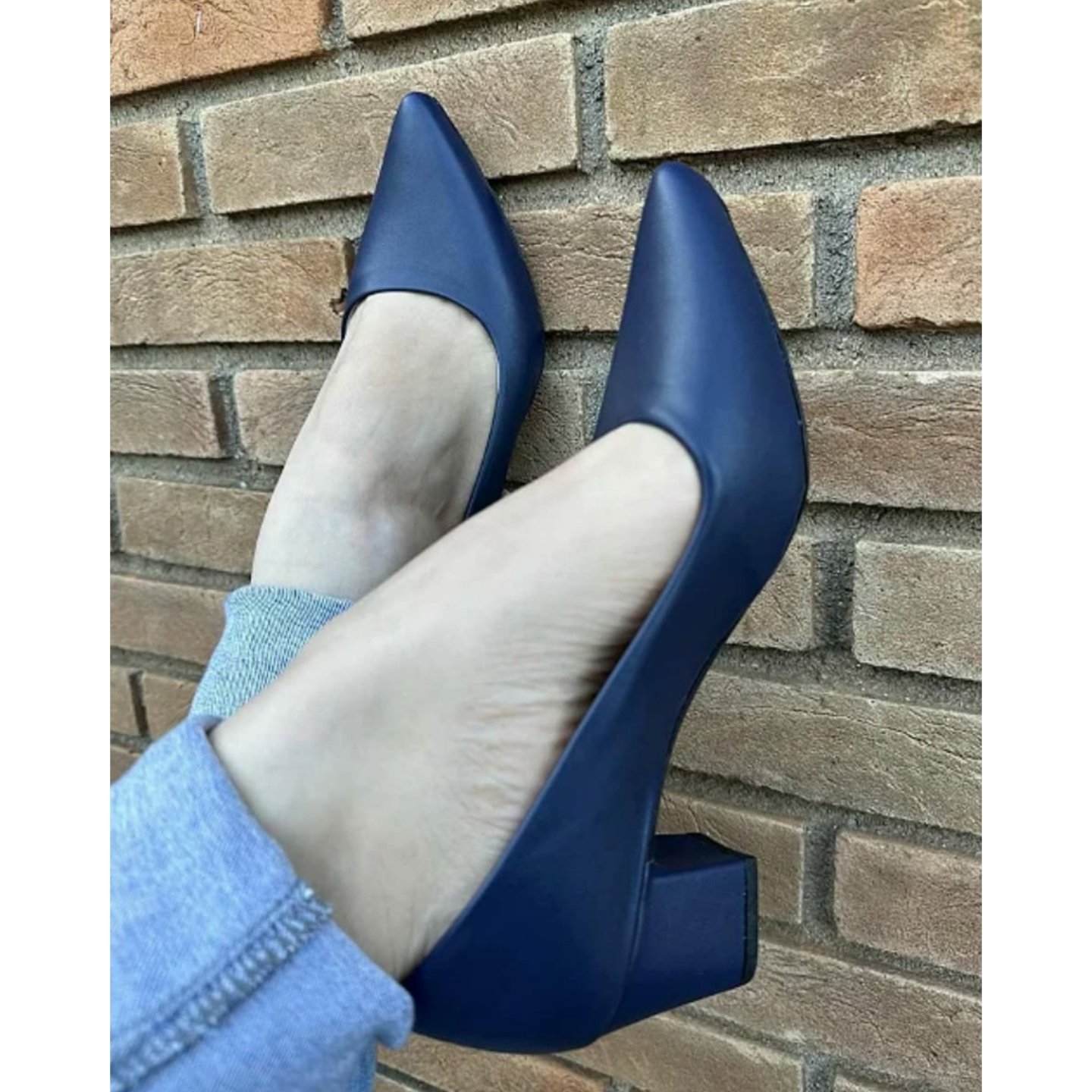 Scarpin bico fino salto baixo, solado pvc, altura 5cm, palmilha acolchoada, protetor de calcanhar.